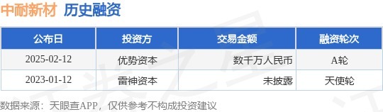 证券之星消息,根据天眼查APP于2月12日公布的信息整理,安徽中耐新材料有限公司A轮融资,融资额数千万人民币,参与投资的机构包括优势资本。